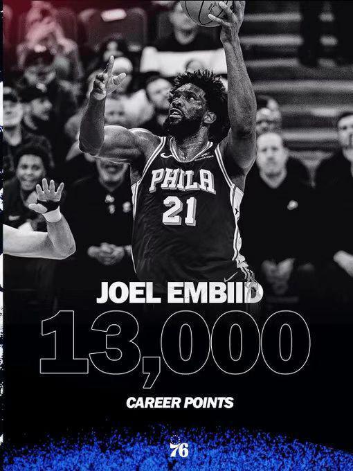 恩比德達(dá)成生涯常規(guī)賽13000分裡程碑,他成為76人隊(duì)史以76人球員身份第7位達(dá)成該成就的球員。