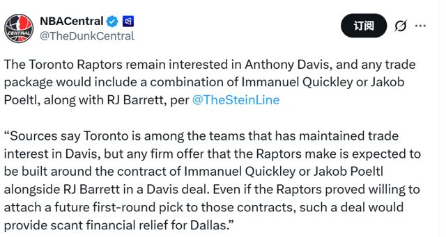 北京時間1月15日,據名記Stein報道,多倫多猛龍隊是有意從獨行俠隊得到安東尼-戴維斯的球隊之一,消息人士稱,猛龍正在評估完成這筆交易所需的籌碼。猛龍的報價將以RJ-巴雷特為核心,另外奎克利和珀爾特爾兩人中,將選擇一位打包交易。