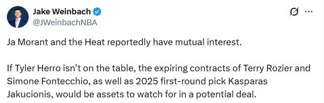 北京時間1月14日,據(jù)NBA記者Jake Weinbach報道,據(jù)報道,賈-莫蘭特與邁阿密熱火隊雙方互有興趣。若泰勒-希羅不被納入交易討論范圍,那麼羅齊爾和豐泰基奧的到期合同,以及2025年首輪秀亞庫西奧尼斯,將成為這筆潛在交易中值得關(guān)註的籌碼。