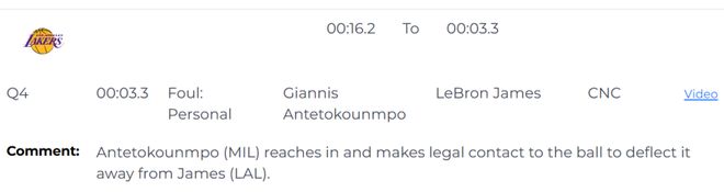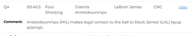 最後40.5秒,字母哥對(duì)詹姆斯的上籃嘗試進(jìn)行瞭合法封蓋。(註:報(bào)告上沒有提到打到詹姆斯手的特納)