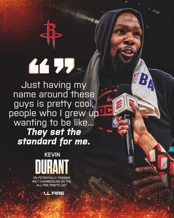 上個(gè)月,杜蘭特成為聯(lián)盟第八位生涯總得分突破31000分的球員,當(dāng)時(shí)他坦言,能夠與詹姆斯、賈巴爾、卡爾-馬龍、科比、喬丹、諾維茨基和張伯倫這些名宿並肩,對他意義重大。