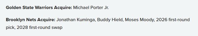 籃網(wǎng)得到:喬納森-庫明加、巴迪-希爾德、摩西-穆迪、2026年首輪簽、2028年首輪簽互換權