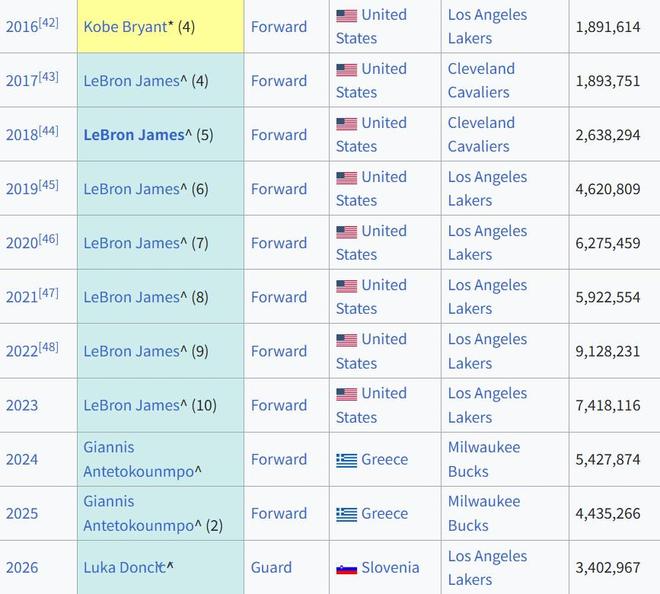 值得一提的是,在此前10年的全明星票選中,東契奇的隊(duì)友詹姆斯7次奪得票王,此外字母哥2次奪魁,科比則在退役賽季奪得票王。