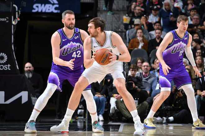 馬刺過去兩場連續(xù)主場戰(zhàn)勝雄鹿與森林狼收獲2連勝,爵士過去3場遭遇3連敗,本賽季首次交鋒馬刺主場114-127輸給爵士。本場馬刺缺少瓦塞爾,爵士缺少凱斯勒、馬爾卡寧、哈克萊斯、尼昂、森薩博。首節(jié)開局馬刺7-8落后,文班亞馬連中兩記三分反超,馬刺被追到15-13僅領(lǐng)先2分。文班亞馬再中三分,馬刺依然被追到20-18僅領(lǐng)先2分,馬刺內(nèi)外開花逐步擴大34-24領(lǐng)先優(yōu)勢,菲利波夫斯基中投得分,首節(jié)比賽結(jié)束馬刺34-26領(lǐng)先爵士。