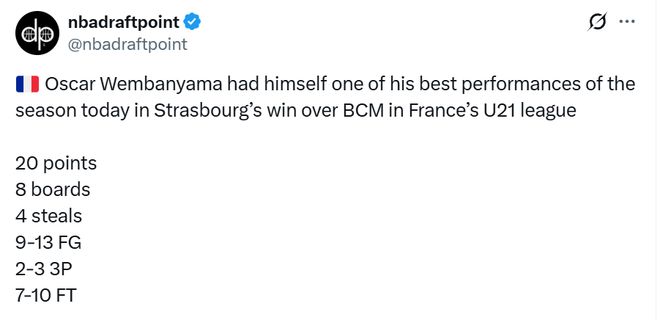 在今日法國U21聯(lián)賽斯特拉斯堡隊戰(zhàn)勝BCM的比賽中,文班亞馬的弟弟奧斯卡-文班亞馬表現(xiàn)出色,全場得到20分8籃板4搶斷,投籃13中9,三分3中2,罰球10中7。奧斯卡現(xiàn)年18歲,目前身高已經(jīng)達到2米03,他將有資格在今年參加NBA選秀。他是一名全能型的前鋒。