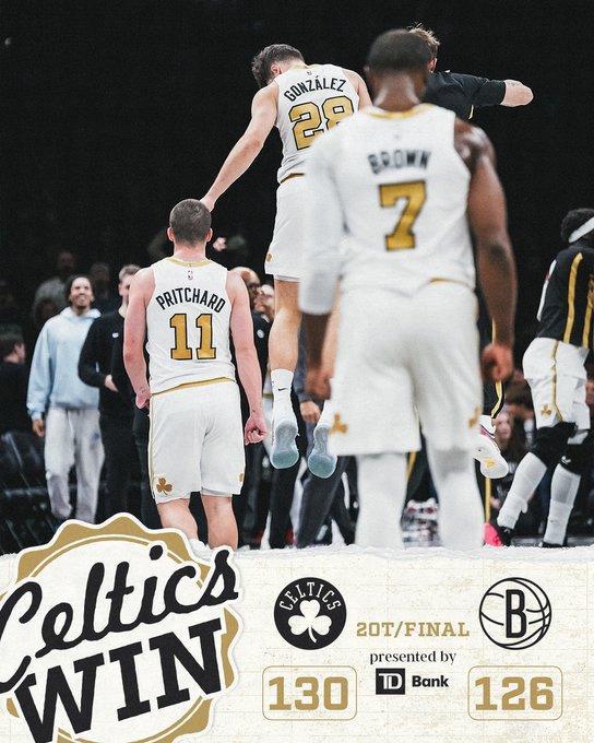 北京時(shí)間1月24日,NBA常規(guī)賽凱爾特人客場對陣籃網(wǎng),雙方前三節(jié)持續(xù)緊咬比分,凱爾特人第四節(jié)中段擴(kuò)大10分優(yōu)勢,籃網(wǎng)強(qiáng)勢扳平比分。首個(gè)加時(shí)賽,岡薩雷斯命中關(guān)鍵扳平三分,凱爾特人第二個(gè)加時(shí)賽表現(xiàn)出色,最終凱爾特人130-126雙加時(shí)戰(zhàn)勝籃網(wǎng)收獲2連勝鞏固東部第二,籃網(wǎng)遭遇4連敗。