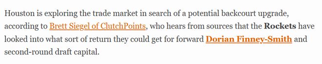 北京時間1月23日,據(jù)名記西格爾報道,休斯頓火箭隊正試水交易市場,尋求補強球隊后場實力。消息人士透露,火箭方面已在評估,若將鋒線球員芬尼-史密斯與次輪選秀權(quán)作為籌碼,能夠換回怎樣的交易回報。