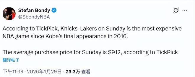 據(jù)票務(wù)平臺(tái)Gametime的數(shù)據(jù)顯示,湖人和尼克斯這場(chǎng)比賽的平均票價(jià)已高達(dá)912美元,這是自2016年4月13日科比退役之戰(zhàn)(當(dāng)時(shí)平均票價(jià)為1049美元)以來(lái),NBA常規(guī)賽票價(jià)的最高紀(jì)錄。而這場(chǎng)比賽的最低入場(chǎng)票價(jià)也達(dá)到了457美元。