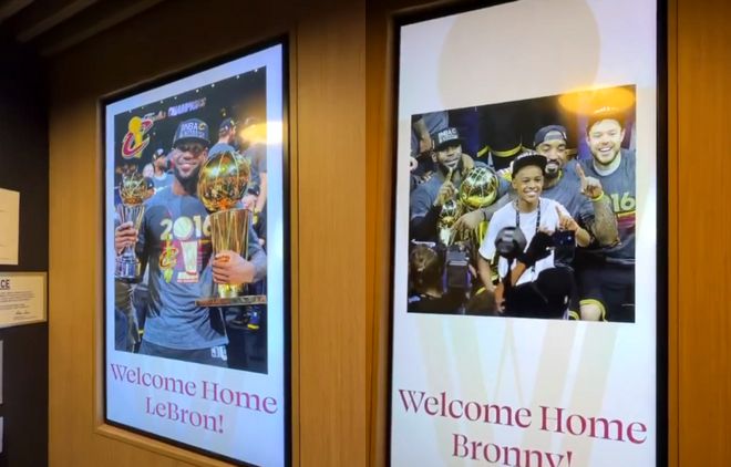 賽前,騎士隊也在客隊更衣室門口掛上了兩張歡迎回家的海報,海報的主角是詹姆斯和他的兒子布朗尼。無獨有偶,就在今天,有報道稱,騎士對詹姆斯第三次加盟持歡迎和開放態(tài)度,當然前提是詹姆斯成為自由球員。畢竟,騎士已經(jīng)超過第二土豪線,很難通過交易來得到詹姆斯。