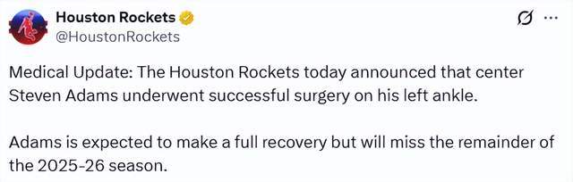 北京時間1月29日,據(jù)ESPN記者Shams報(bào)道,火箭隊(duì)中鋒史蒂文-亞當(dāng)斯因左腳踝傷勢接受手術(shù),將缺席2025-26賽季剩余全部比賽。隨后,火箭官方宣布了這一消息。亞當(dāng)斯本人曬出術(shù)后病床照:一切都很順利,感謝你們所有的關(guān)心和祈禱。