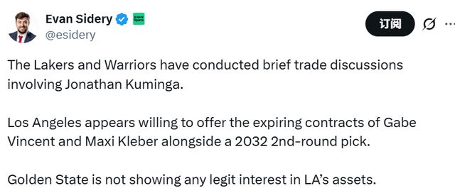 北京時間1月27日,名記Sidery報道,湖人和勇士近期圍繞庫明加展開了簡短的交易談判。勇士隊已在私下明確表態(tài):對于湖人隊為庫明加開出的交易籌碼,他們并無實質(zhì)興趣。