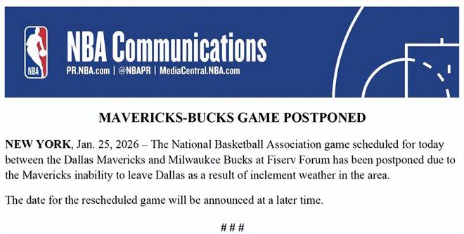 另外,根據(jù)原定賽程,密爾沃基雄鹿隊(duì)將于北京時(shí)間今日上午8點(diǎn)主場(chǎng)迎戰(zhàn)獨(dú)行俠隊(duì),然而獨(dú)行俠隊(duì)于當(dāng)?shù)貢r(shí)間周六晚間未能順利飛抵密爾沃基。目前,球隊(duì)仍滯留達(dá)拉斯。NBA同樣官方宣布,本場(chǎng)比賽因惡劣天氣原因,比賽延期舉行,補(bǔ)賽日期將另行公布。