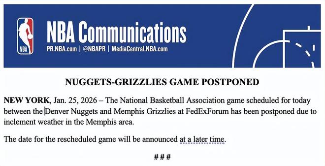 NBA官方在比賽開(kāi)球前不到三小時(shí)發(fā)布公告稱,鑒于孟菲斯地區(qū)的惡劣天氣狀況,本場(chǎng)比賽將擇期重賽。該地區(qū)自當(dāng)?shù)貢r(shí)間周六清晨起便持續(xù)遭遇雨夾雪和凍雨天氣,且降雪、凍雨交織的狀況一直延續(xù)至周日上午。掘金與灰熊兩隊(duì)球員及本場(chǎng)執(zhí)法裁判組均已抵達(dá)孟菲斯,但比賽最終還是延期舉行。