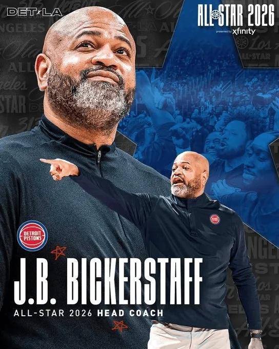活塞官方曬出海報祝賀比克斯塔夫,同時配文寫道:“比克斯塔夫?qū)⒄綋?6年NBA全明星賽主教練!”